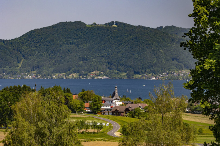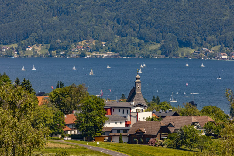 Die sonnige Ostausrichtung sorgt für stimmungsvolle Morgensonne und unterstreicht den freien Blick auf den Attersee.