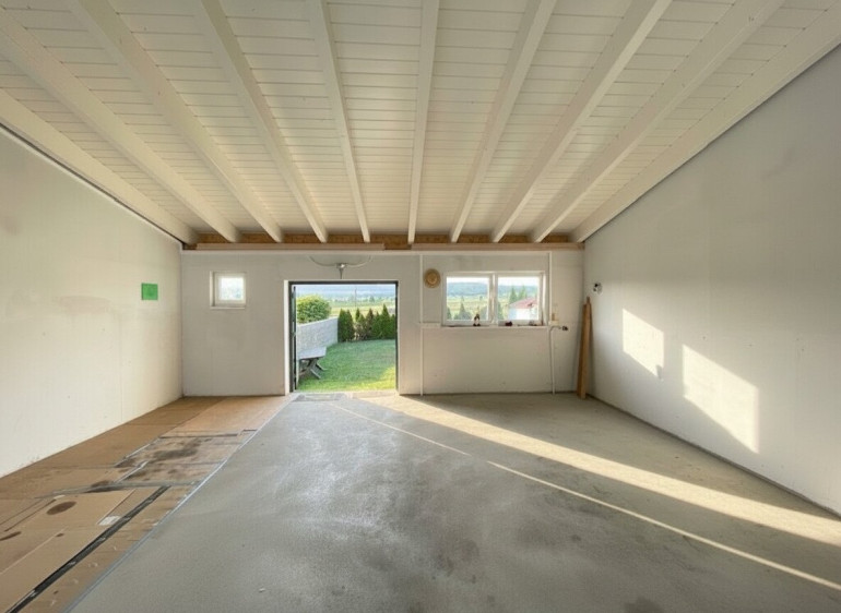 Die Einstellhalle wurde mit Strom, Wasser, Kanalanschluss ausgestattet; somit ist bereits dieses Objekt für einen Umbau als Wohnhaus geeignet.