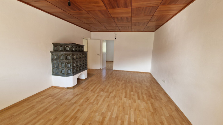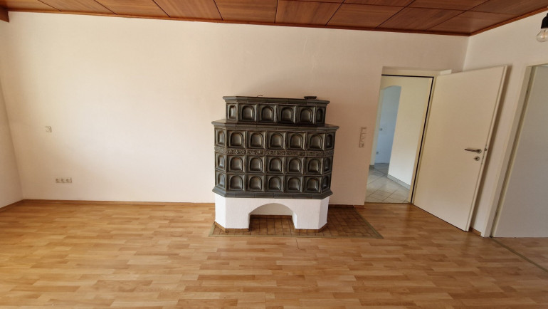 Das freundlich helle Wohnzimmer verfügt über einen schönen Kachelofen und einen Zugang zur großen Loggia.