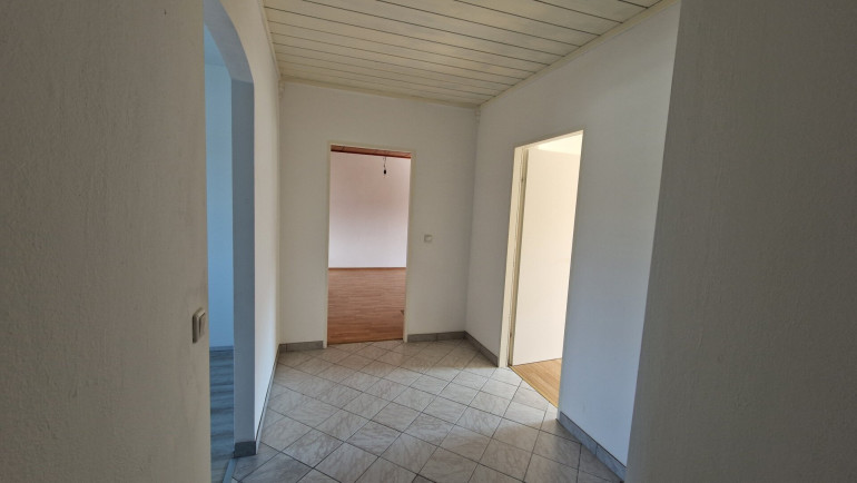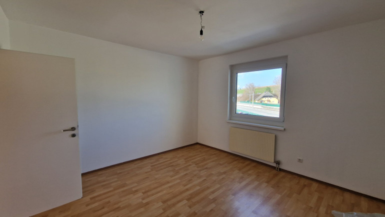 Die Raumaufteilung ist besonders praktisch: Der Vorraum verbindet zentral alle Räume – mit Ausnahme des Hauptschlafzimmers, das über das Wohnzimmer zugänglich ist. Dazu gehören das Bad, ein separates WC, ein Abstellraum, die unmöblierte Küche, ein Kinderzimmer sowie das Wohnzimmer.