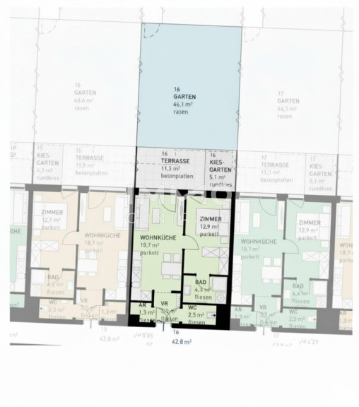 Bei Bedarf an mehr Wohnfläche berät das Vertriebsteam gern: Auf Wunsch lassen sich übereinanderliegende Einheiten zu einer Maisonette (4 Zimmer) verbinden oder nebeneinanderliegende Wohnungen zu größeren Einheiten zusammenlegen. Für Eigentümer besteht optional die Möglichkeit eines eigenen Gartenabteils; alle Gartenflächen werden mit Strom und Wasseranschluss versehen.