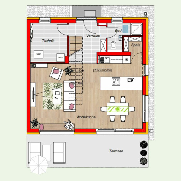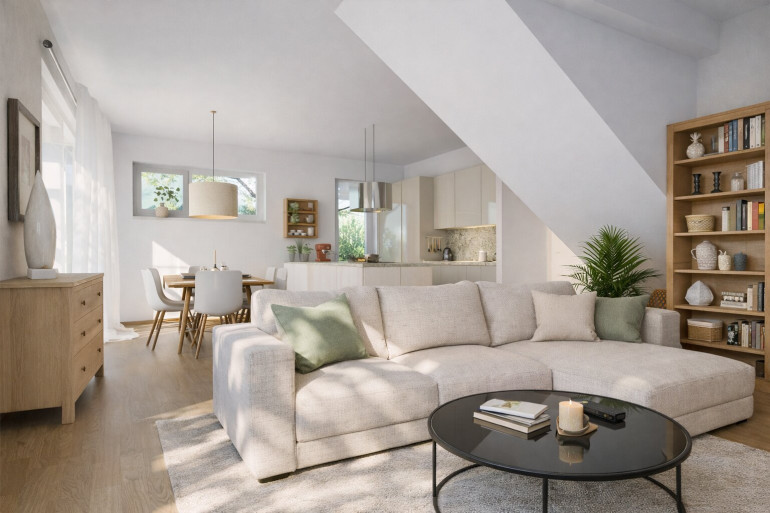 Die dargestellten Schaubilder wurden teilweise digital bearbeitet bzw. mithilfe künstlicher Intelligenz visualisiert. Sie dienen ausschließlich der beispielhaften Darstellung von Einrichtungs- und Gestaltungsmöglichkeiten und stellen keinen verbindlichen Ausführungs- oder Lieferumfang dar. Maßgeblich für die tatsächliche Ausführung sind ausschließlich die vertraglichen Vereinbarungen, Bau- und Ausstattungsbeschreibungen sowie die genehmigten Pläne. Abweichungen in Ausstattung, Materialien, Farben, Möblierung oder Bepflanzung sind möglich.