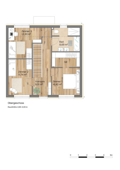 Herzstück ist die großzügige Wohnküche mit praktischer Speis, die sich zum Garten hin öffnet: drinnen leben, draußen weiteratmen. Die 2,85 m Raumhöhe im Erdgeschoss verstärkt das großzügige Raumgefühl und verleiht dem Zuhause eine besondere Weite. Im Wohnzimmer sorgt ein sehr großes Fenster mit einer Parapethöhe von nur 43 cm für extra viel Licht – ideal, um den Bereich mit einer integrierten Sitzfläche als gemütlichen Lieblingsplatz zu gestalten. Eine großformatige Verglasung inklusive Hebeschiebetüre zur Terrasse bilden einen fließenden Übergang zwischen Innen und Außen. Drei Schlafzimmer schaffen Rückzugsorte für jedes Familienmitglied, ergänzt durch einen Schrankraum und zwei Bäder für entspannte Morgen und ruhige Abende.