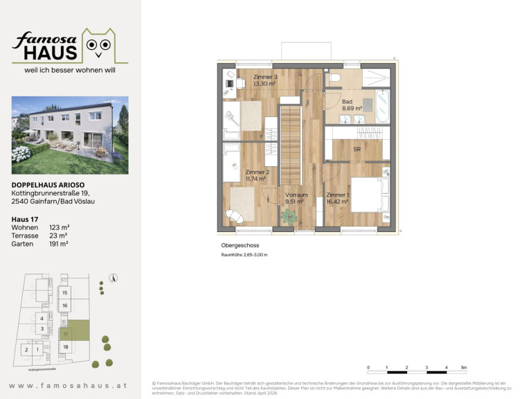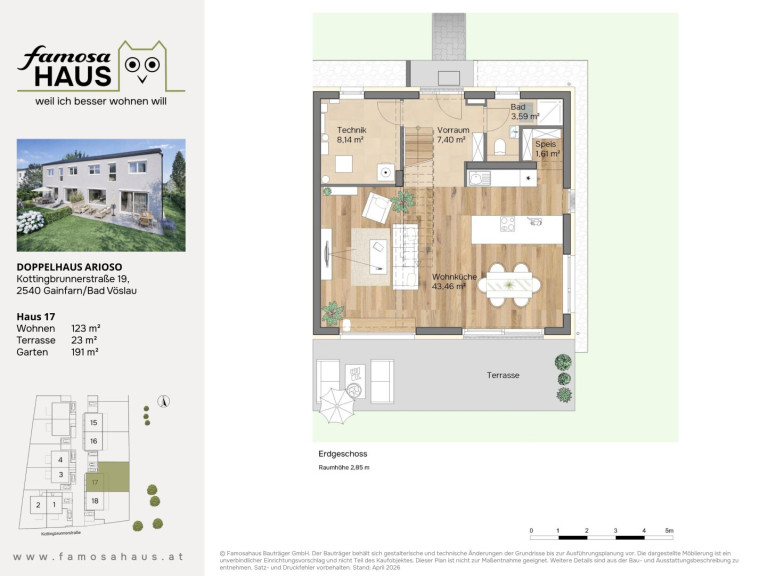 Der Haustyp „Arioso“ steht für lichtdurchflutetes, offenes Wohnen mit spürbarer Leichtigkeit. Auf 123 m² Wohnfläche trifft solide Ziegelbauweise auf eine Planung, die den Alltag schöner macht – mit klaren Linien, viel Tageslicht und einem Wohngefühl, das sofort ankommt.