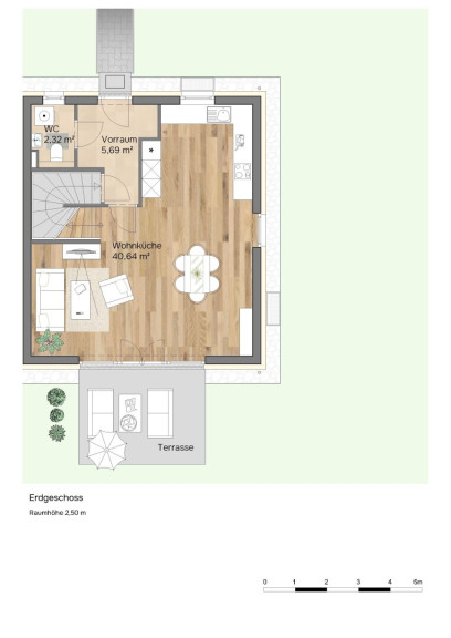 Die dargestellten Schaubilder wurden teilweise digital bearbeitet bzw. mithilfe künstlicher Intelligenz visualisiert. Sie dienen ausschließlich der beispielhaften Darstellung von Einrichtungs- und Gestaltungsmöglichkeiten und stellen keinen verbindlichen Ausführungs- oder Lieferumfang dar. Maßgeblich für die tatsächliche Ausführung sind ausschließlich die vertraglichen Vereinbarungen, Bau- und Ausstattungsbeschreibungen sowie die genehmigten Pläne. Abweichungen in Ausstattung, Materialien, Farben, Möblierung oder Bepflanzung sind möglich.