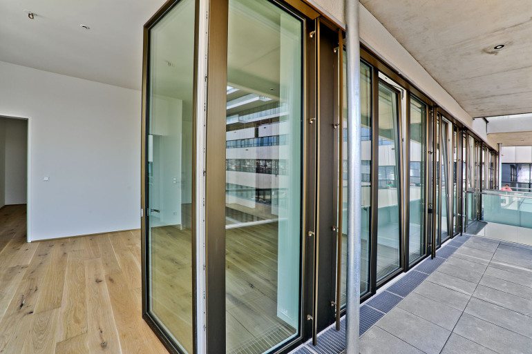 Der Bauteil JOSEPH besteht aus den beiden Baukörpern TURM und RIEGEL. Beide sind in eleganter Sachlichkeit, mit Betonelementen, viel Glas, grauen mattem Feinsteinzeug und vielen bodentiefen Fenstern ausgestattet.