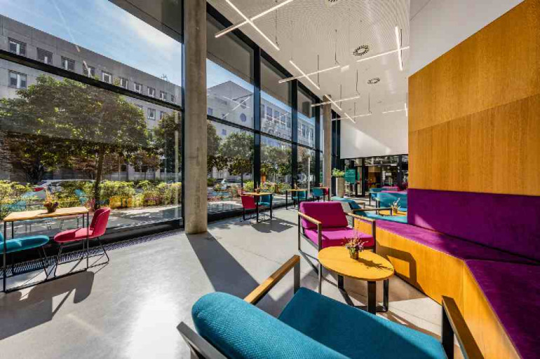 BESCHREIBUNGDie repräsentative Lobby mit Empfangsbereich sowie großzügigen Aufenthalts- und Arbeitszonen, zusammen mit der umfangreichen Infrastruktur direkt im Gebäude (Billa, La ViE Bistro) und auf dem Gelände (Brass Monkey Café, Restaurant Ebi, SV Kantine, Fit Inn Fitnessstudio), bieten Ihnen alle Annehmlichkeiten, die Ihren Arbeitsalltag im neuen Büro angenehm gestalten. Mieter des ViE haben außerdem Zugang zu den Gemeinschaftsbereichen im gegenüberliegenden CA Immo Bürocluster Lände, wie einem Veranstaltungsraum inklusive Serviceleistungen und einem Gymnastikraum.