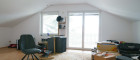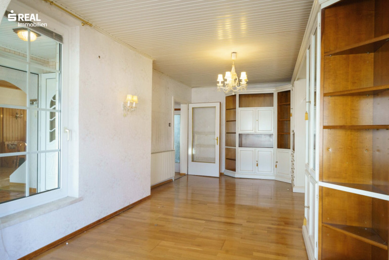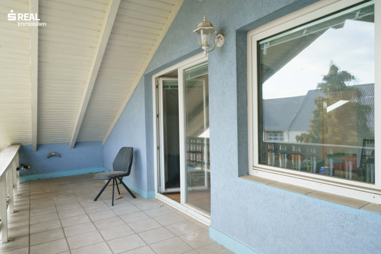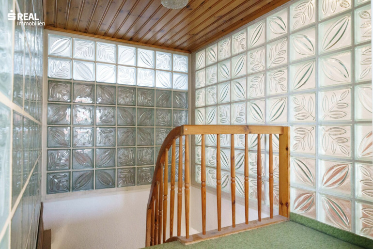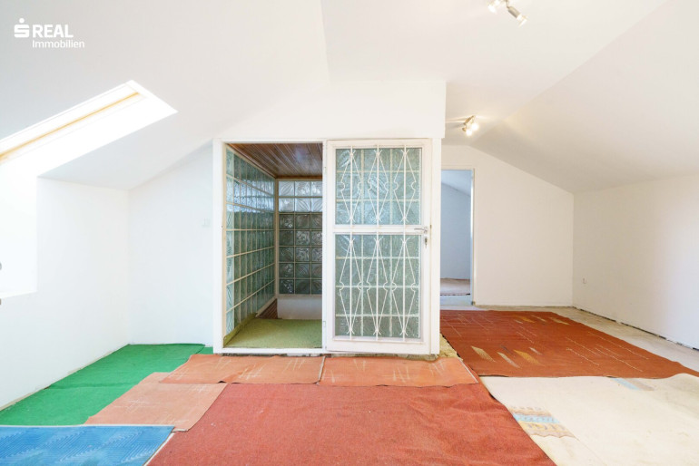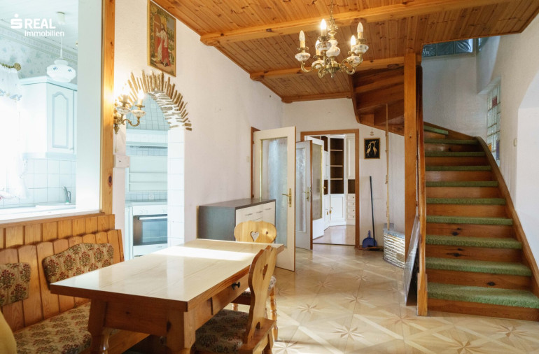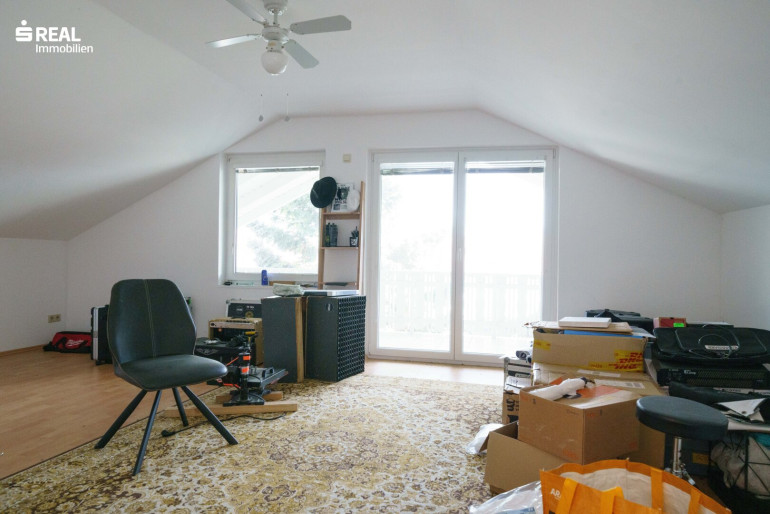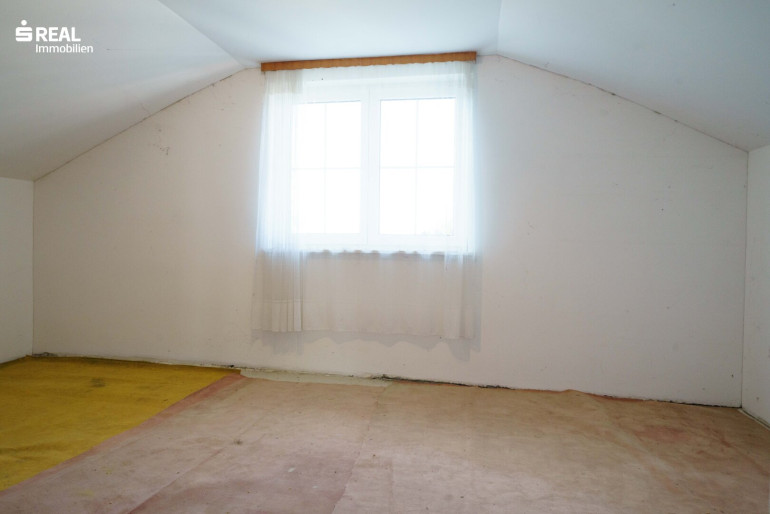Der schöne Holzstiegenaufgang führt in das teilweise ausgebaute Dachgeschoß mit einem Mittelzimmer welches wohnlich genutzt werden kann und einem größeren Balkonzimmer (Südostseite), sowie einem kleineren Zimmer mit Zugang zu einem Dachbodenraum im Kniestock. Von hier hat man einen wunderschönen Ausblick über den Garten (Nordwestseite).