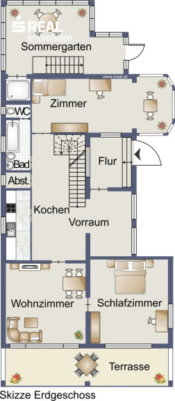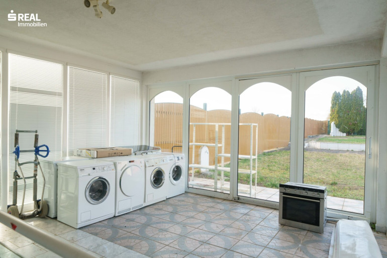 Der Sommergarten wurde nachträglich dazu gebaut und ist zum Garten hin ausgerichtet, mit einer Größe von ca. 32m² beinhaltet dieser eine Dusche und den Treppenabgang zum Keller.