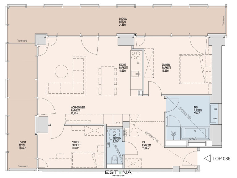 Panoramablick inklusive: Jede einzelne Wohnung verfügt über eine umlaufende Loggia. Erweitern Sie Ihren Wohnraum nach draußen und genießen Sie spektakuläre Sonnenuntergänge über der Donau und der Wiener Skyline.