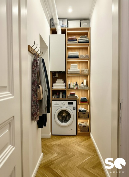 einen zusätzlichen gut nutzbaren Abstellraum in dem Waschmaschine und Therme elegant verborgen werden können.(ca. 2,8 m²),