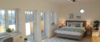 Das Haupt-Badezimmer befindet sich im Obergeschoss und ist mit einer Eckbadewanne, mit einer Duschkabine, zwei Waschbecken und einem Handtuchhalter ausgestattet. Das WC ist extra untergebracht. Ebenso befindet sich ein Badezimmer im Erdgeschoss und auch eines im Untergeschoss.