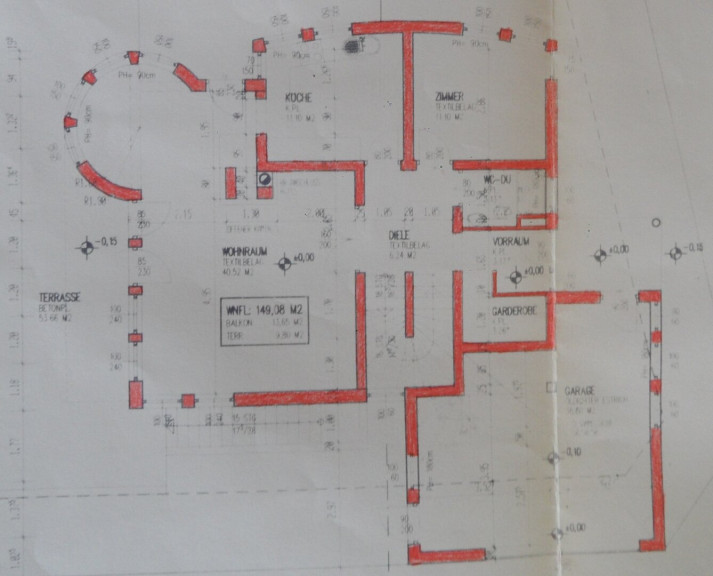 Keller: Vorraum (ca. 6,87), Badezimmer mit WC (ca. 3,13 m²), Waschraum ( ca. 11,10 m²), Lagerraum (ca. 11,10 m²), Kellerraum (ca. 30,40 m²), Lagerraum (ca. 14,94 m²), Partyraum (ca. 31,00 m²), Technikraum (ca. 8,25 m²).