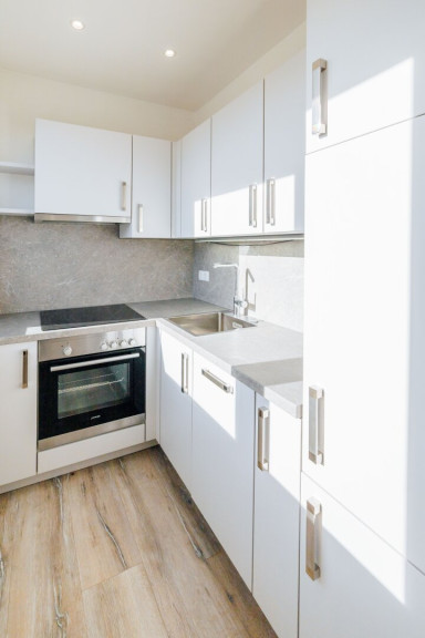 Ein besonderes Highlight ist die separate Küche, die sich direkt an den Wohnraum anschließt, aber dennoch räumlich klar abgegrenzt ist. Sie ist modern ausgestattet und verfügt über alle notwendigen Geräte – vom Backrohr über das Ceranfeld bis hin zum Kühlschrank. Damit ist sowohl für schnelles Kochen im Alltag als auch für aufwendigere Menüs die perfekte Grundlage geschaffen.