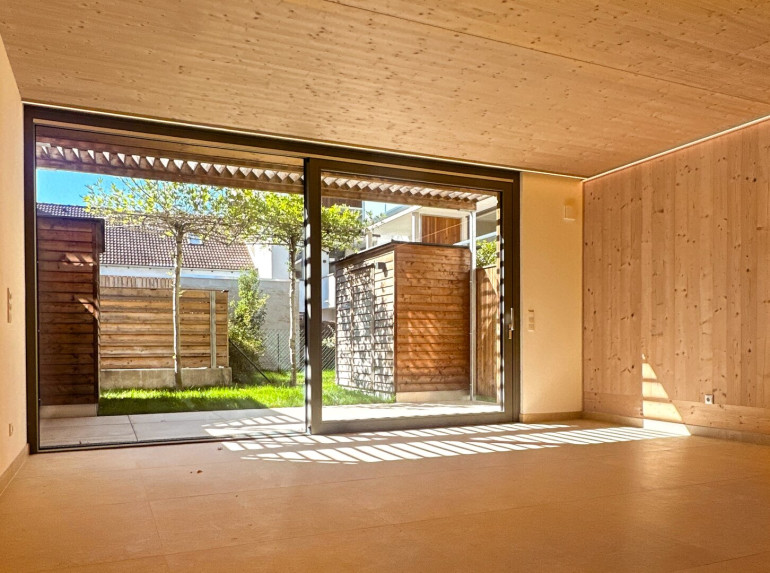 Der offene Wohn- und Essbereich bildet das Zentrum der Maisonette und bietet direkten Zugang zur Terrasse, Loggia und zum Garten. Über die interne Treppe gelangen Sie in die obere Ebene, die weitere Zimmer für Schlafzimmer, Kinderzimmer oder Homeoffice bereitstellt. Große Fensterflächen sorgen für viel Tageslicht und ein offenes, freundliches Wohnambiente.