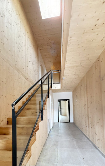 Die Bauweise mit Holz- und Massivbauelementen sowie moderner Dämmung sorgt für niedrige Betriebskosten und ein angenehmes Raumklima.