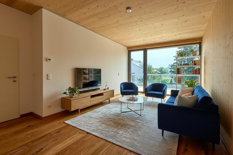 Die Bauweise mit Holz- und Massivbauelementen sowie moderner Dämmung sorgt für niedrige Betriebskosten und ein angenehmes Raumklima.