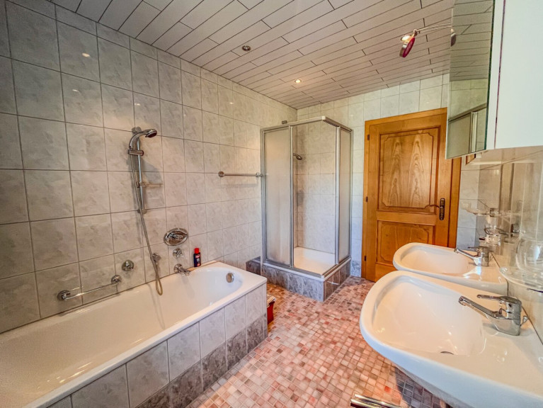 Parkett, Fliesen, Zentralheizung, Einbauküche, Bad mit Fenster, Badewanne, Dusche, Garage