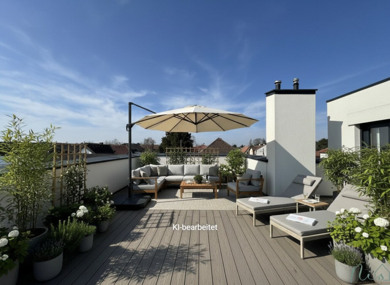 EINSTÜCK HIMMEL NUR FÜR SIE - 60 m2 uneinsichtiger Dachterrasse - Wohnküche, 3 Schlafzimmer, 2 Bäder, WC auf 2 Ebenen - FBH, Solaranlage und Wärmepumpe