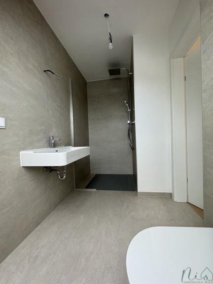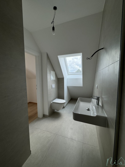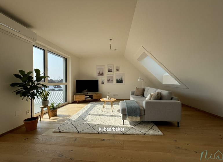 Dachgeschoss – das Herzstück: Eine elegante Innentreppe führt Sie hinauf in eine Welt voller Licht und Weite. Die offene Wohnküche (48,11 m²) mit großzügiger Dachverglasung durch zwei Dachflächenfenster ist mehr als ein Raum – sie ist eine Bühne für das Leben. Kochen, Essen, Entspannen – alles fließt hier in einem lichtdurchfluteten Open-Space-Konzept zusammen. Ein zusätzliches Bad mit Regendusche & WC auf dieser Ebene sorgt für optimalen Komfort beim Empfang von Gästen.