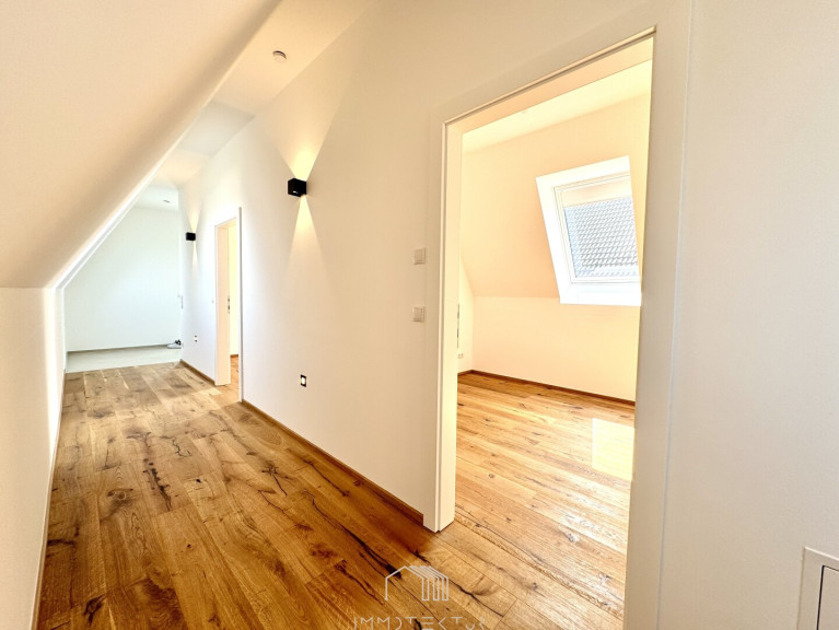 Die Wohnung befindet sich im oberen Geschoß eines modernen, zweigeschossigen Hauses und bietet auf großzügigen 91 m² Wohnfläche ein perfekt durchdachtes Raumkonzept: