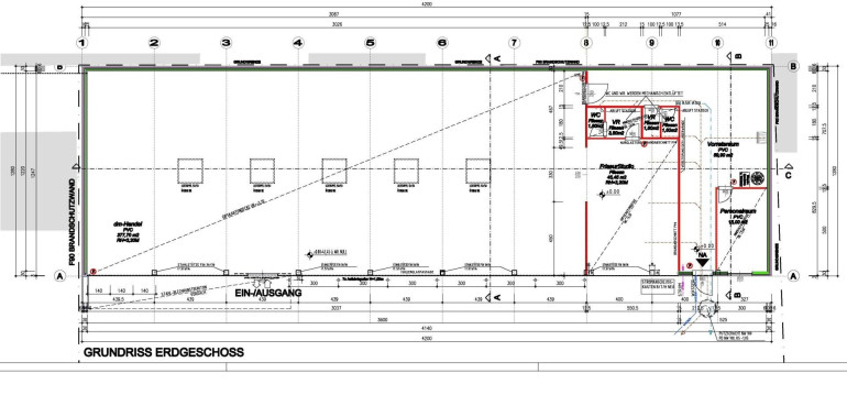 Das Geschäftslokal umfasst eine Gesamtnutzfläche von ca. 500 m², inkl. Lager, Personalraum und WCs.