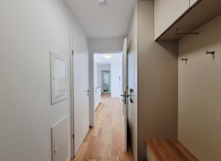 Vorzimmer, Wohnküche sowie zwei Zimmer jeweils mit Terrassen- und Balkonzugang, Abstellraum, Badezimmer sowie separates WC.