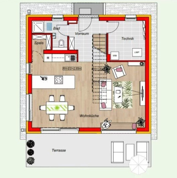 Die dargestellten Schaubilder wurden teilweise digital bearbeitet bzw. mithilfe künstlicher Intelligenz visualisiert. Sie dienen ausschließlich der beispielhaften Darstellung von Einrichtungs- und Gestaltungsmöglichkeiten und stellen keinen verbindlichen Ausführungs- oder Lieferumfang dar. Maßgeblich für die tatsächliche Ausführung sind ausschließlich die vertraglichen Vereinbarungen, Bau- und Ausstattungsbeschreibungen sowie die genehmigten Pläne. Abweichungen in Ausstattung, Materialien, Farben, Möblierung oder Bepflanzung sind möglich.