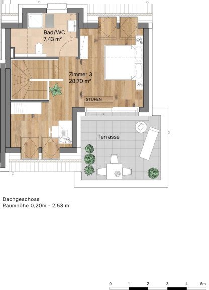 Im Obergeschoss schaffen drei Schlafzimmer und ein großes Badezimmer viel Raum für Rückzug, Struktur und Komfort. Das Dachgeschoss setzt einen besonderen Akzent: ein weiteres Schlafzimmer, ein zusätzliches Bad, Platz für ein Büro und eine private Terrasse – ideal als Master-Bereich, ruhiger Arbeitsraum oder persönliche Auszeit über den Dächern.