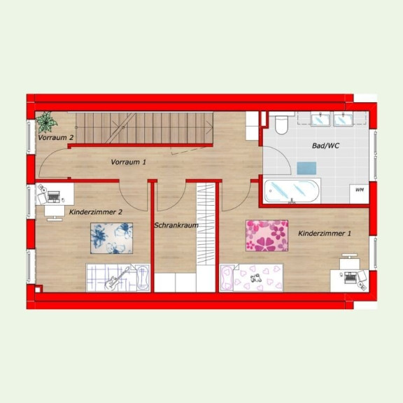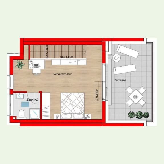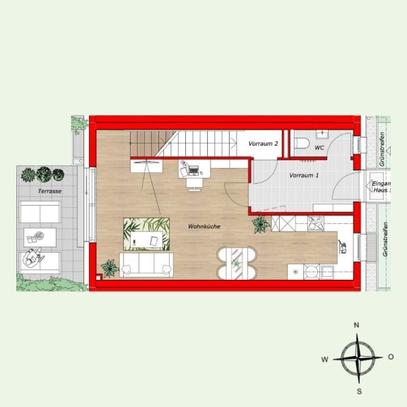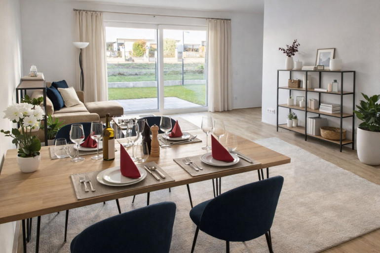 Die dargestellten Schaubilder wurden teilweise digital bearbeitet bzw. mithilfe künstlicher Intelligenz visualisiert. Sie dienen ausschließlich der beispielhaften Darstellung von Einrichtungs- und Gestaltungsmöglichkeiten und stellen keinen verbindlichen Ausführungs- oder Lieferumfang dar. Maßgeblich für die tatsächliche Ausführung sind ausschließlich die vertraglichen Vereinbarungen, Bau- und Ausstattungsbeschreibungen sowie die genehmigten Pläne. Abweichungen in Ausstattung, Materialien, Farben, Möblierung oder Bepflanzung sind möglich.