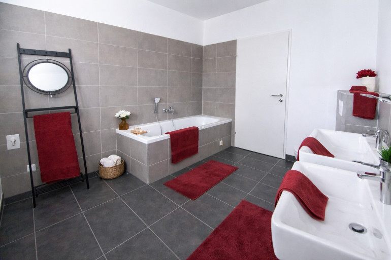 Je nach Objekt werden Kaufpreise mit und ohne Oberflächenpaket angeboten. Das Oberflächenpaket beinhaltet Malerarbeiten, Fliesen-/Plattenarbeiten (z. B. Feinsteinzeug 60 × 60 cm „Ares Warm Beige“) und Bautischlerarbeiten (z. B. Fertigparkett Eiche Landhausdiele), hochwertige Sanitärausstattung z.B. mit Villeroy und Boch. Für weitere Informationen zur Bau- und Ausstattung kontaktieren Sie uns gerne.