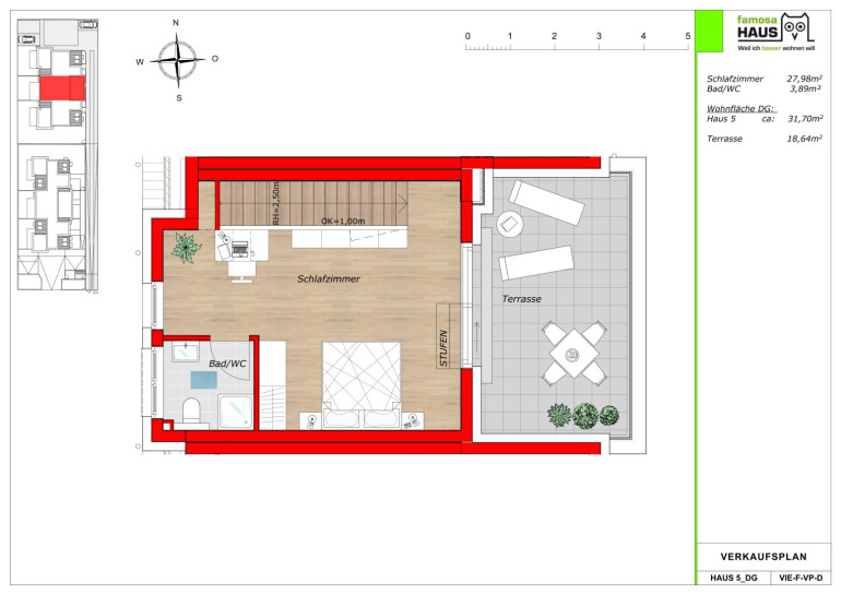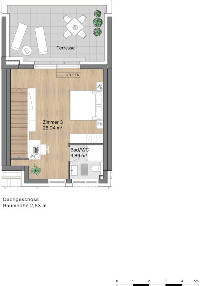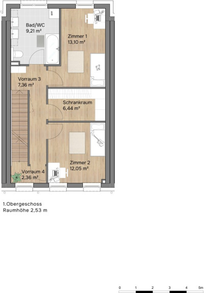 Im Obergeschoss schaffen zwei Schlafzimmer, ein Schrankraum und ein großes Badezimmer ideale Voraussetzungen für Rückzug und Komfort im Alltag. Das Dachgeschoss rundet das Raumangebot mit einem weiteren Schlafzimmer, zusätzlichem Bad, Platz für ein Büro und einer privaten Terrasse ab – perfekt als Master-Bereich, Home Office oder persönliche Ruhezone.
