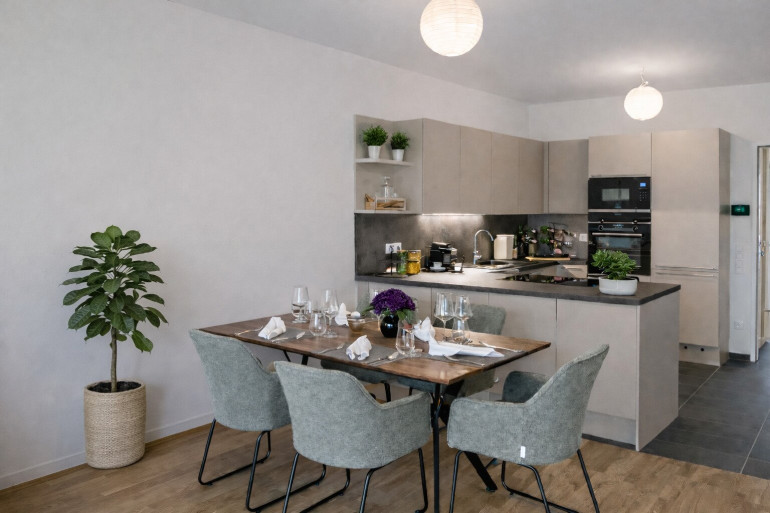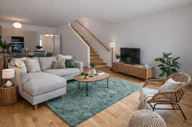 Herzstück ist die großzügige Wohnküche, die sich zum sonnigen Garten öffnet – perfekt für gemeinsames Kochen, entspannte Nachmittage und lange Abende im Freien. Auf den Wohnebenen ergänzen zwei Schlafzimmer, ein Schrankraum und ein Badezimmer das stimmige Raumkonzept.