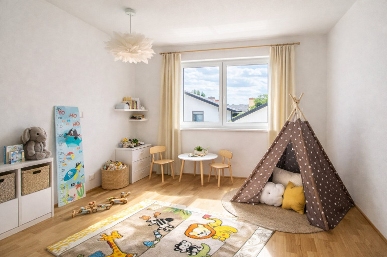 Im Erdgeschoss bilden großzügiges Wohnzimmer und Küche das Herzstück des Hauses, ergänzt durch Vorraum und WC. Von hier öffnet sich das Zuhause in den sonnigen Garten – ein ruhiger Rahmen für Alltag und Auszeiten im Freien.