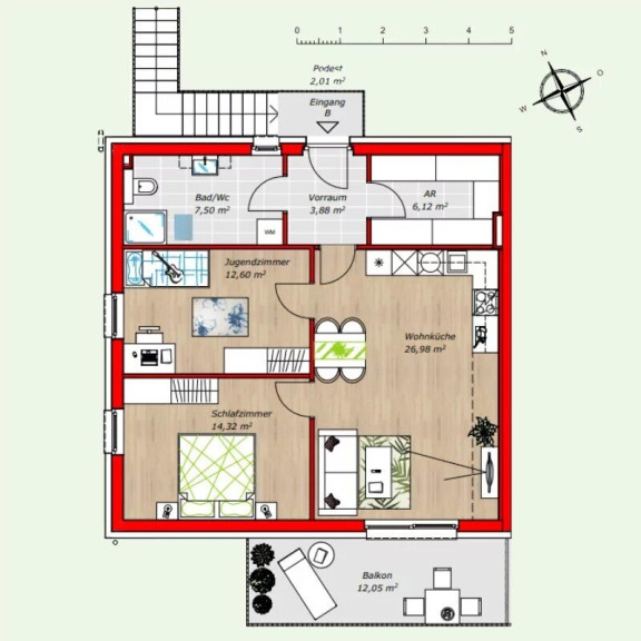 Die dargestellten Schaubilder wurden teilweise digital bearbeitet bzw. mithilfe künstlicher Intelligenz visualisiert. Sie dienen ausschließlich der beispielhaften Darstellung von Einrichtungs- und Gestaltungsmöglichkeiten und stellen keinen verbindlichen Ausführungs- oder Lieferumfang dar. Maßgeblich für die tatsächliche Ausführung sind ausschließlich die vertraglichen Vereinbarungen, Bau- und Ausstattungsbeschreibungen sowie die genehmigten Pläne. Abweichungen in Ausstattung, Materialien, Farben, Möblierung oder Bepflanzung sind möglich.