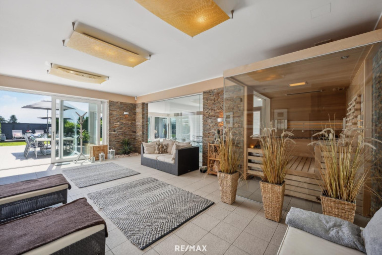 Das 2.608 m² große Grundstück bietet viel Platz für Privatsphäre und Entfaltung. Der weitläufige Außenbereich mit rund 220 m² Terrassenfläche lädt zum Entspannen und Genießen ein, während das Hallenbad ca. 4x8m, der Whirlpool außen, die Sauna und der eigene Sportbereich für maximale Erholung und Freizeitqualität sorgen. Ein besonderer Blickfang ist der stilvolle Weinkeller, der Liebhaber edler Tropfen begeistert.
