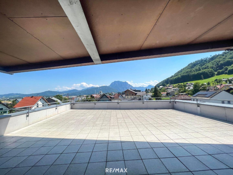 Ein besonderes Highlight ist die beeindruckende, rund 120 m² große Dachterrasse, die einen traumhaften Blick auf den majestätischen Traunstein eröffnet – ein perfekter Ort für entspannte Stunden im Freien.