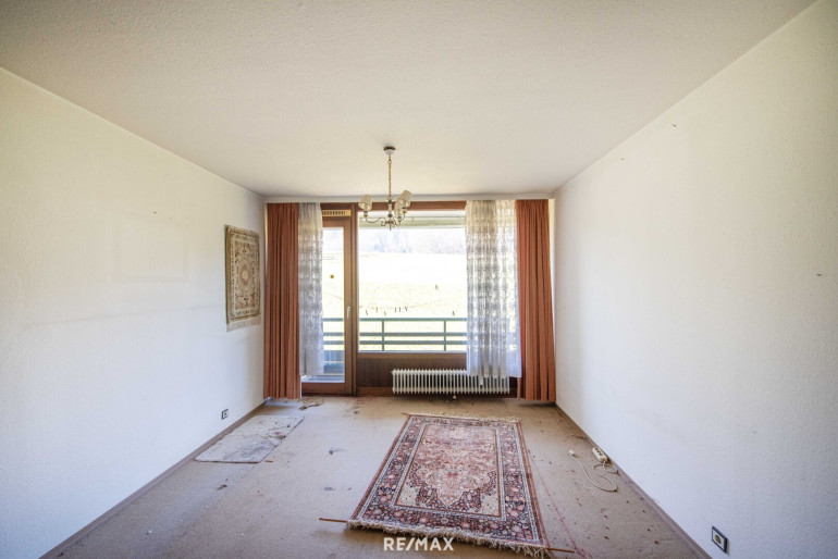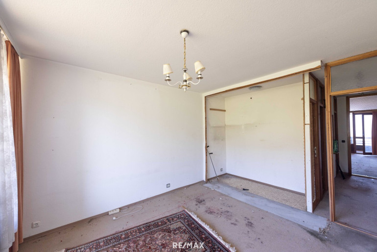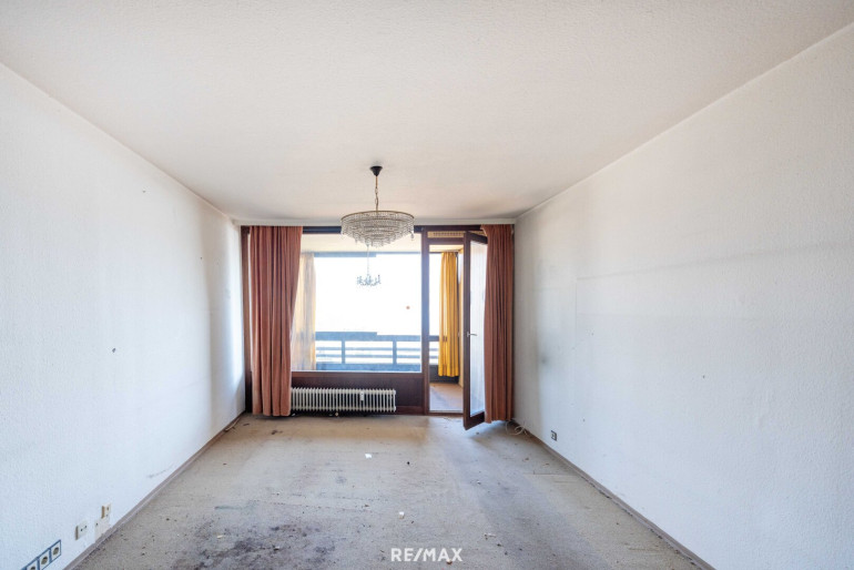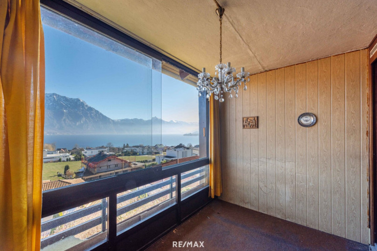 Sämtliche Möbel wurden bereits entfernt, sodass die Räumlichkeiten leer stehen und eine umfassende Sanierung unmittelbar beginnen kann. Das Potenzial dieser Wohnung entfaltet sich besonders durch die gute Raumaufteilung. Das Herzstück bildet das helle Wohnzimmer mit direktem Zugang zur verglasten Loggia, von der aus man den Blick weit über den See schweifen lassen kann. Das Schlafzimmer liegt ruhig an der Rückseite des Gebäudes und verfügt über eine zweite Loggia mit Blick ins Grüne.