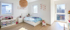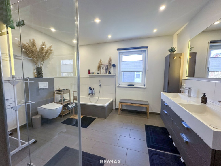 Im Obergeschoss stehen zwei sehr großzügige Schlafzimmer sowie ein weiteres Zimmer zur Verfügung. Das geräumige Badezimmer überzeugt mit Badewanne und Dusche, Doppelwaschbecken sowie ausreichend Platz für Waschmaschine und Trockner – eine wahre Wohlfühloase.