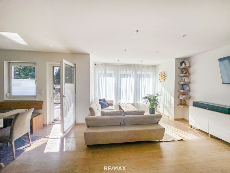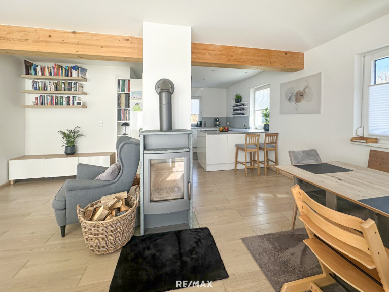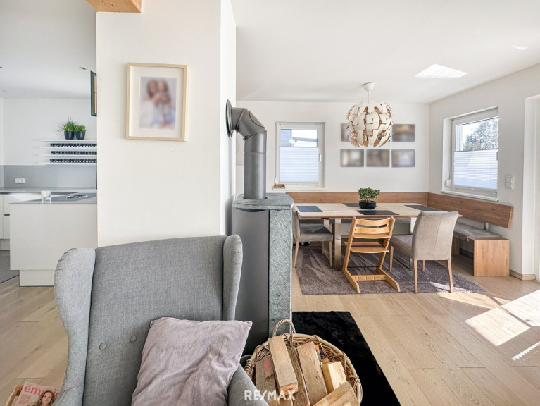Von der großzügigen Doppelgarage sowie den davorliegenden Stellplätzen gelangen Sie über einen einladenden Zugang in das Haus. Im Erdgeschoss empfängt Sie ein Vorraum, von dem aus Sie ein Büro mit direktem Zugang zur Terrasse, ein Gäste-WC sowie den großzügigen und gemütlichen Wohnbereich betreten. Ein zentral platzierter Holzofen sorgt hier für eine besonders behagliche Atmosphäre. Beheizt wird das Haus mittels moderner Luftwärmepumpe in Kombination mit komfortabler Fußbodenheizung.