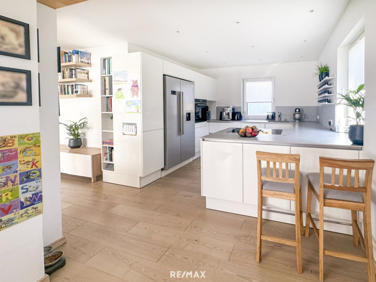 Die offen gestaltete, moderne Küche bietet einen idealen Überblick über den Wohn- und Essbereich sowie den Garten – perfekt für das Familienleben und gesellige Abende mit Freunden.