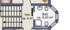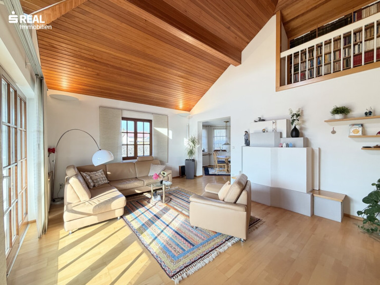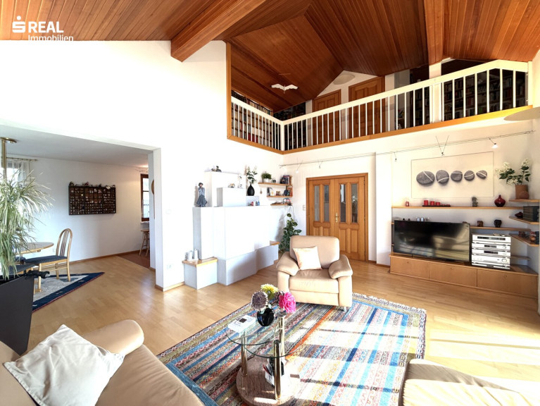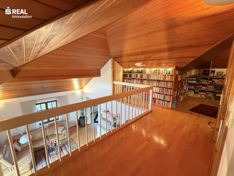 Ein weiterer halber Stock führt zu der offenen Galerie, die sich ideal als Lese- oder Rückzugsbereich eignet. Von hier blickt man hinunter in den Wohnbereich und erlebt die besondere Architektur des Hauses. Zusätzlich besteht Zugang zum Dachboden, der praktischen Stauraum bietet.