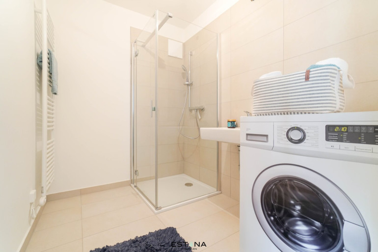 - Badezimmer mit Dusche, Waschbecken und Waschmaschinenanschluss