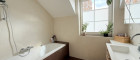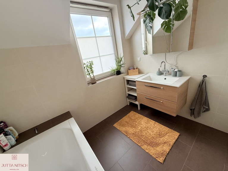 - Badezimmer mit Waschtisch, Badewanne und Waschmaschinenanschluss