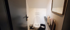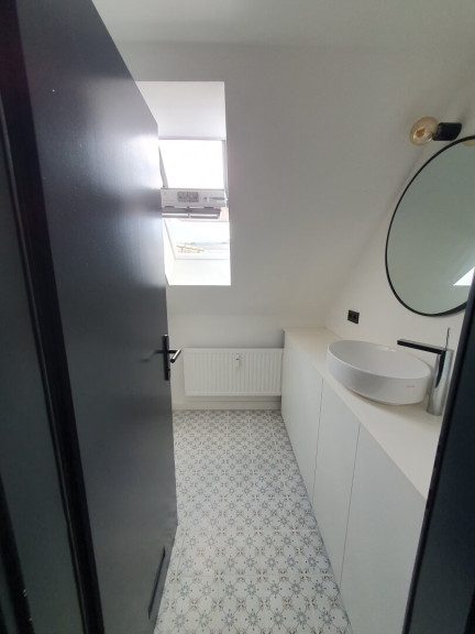 Der durchdachte Grundriss umfasst ein lichtdurchflutetes Zimmer, das ausreichend Platz für individuelle Wohnideen bietet. Die hochwertige Einbauküche ist perfekt in den Wohnraum integriert und überzeugt durch funktionales und modernes Design. Die Kombination aus eleganten Fliesen und warmem Parkett schafft eine einladende Atmosphäre.