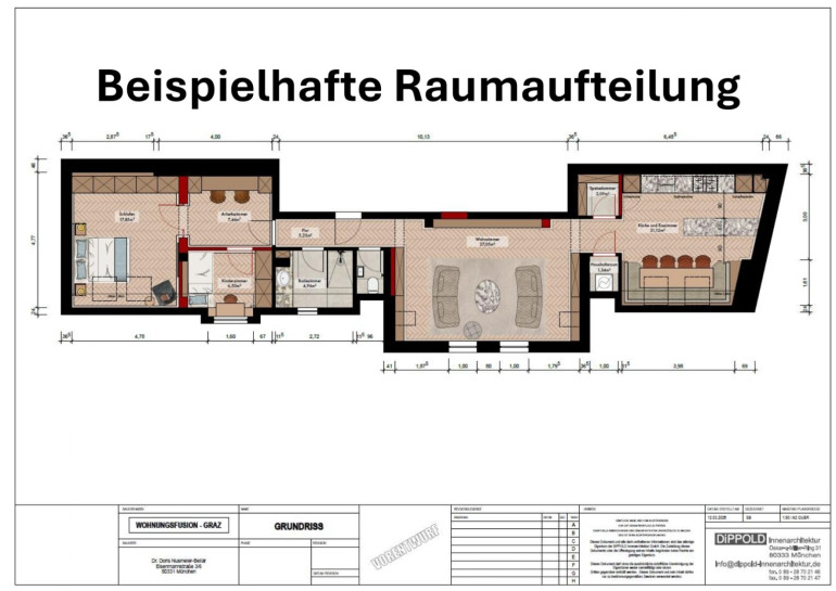 Der im Titelfoto angeführte Grundriss zeigt eine beispielhafte Raumaufteilung für den Fall einer Zusammenlegung beider Wohnungen zu einer Einheit von ca. 96 m². Diese Darstellung dient ausschließlich der Veranschaulichung und stellt keinen beim Bauamt eingereichten oder genehmigten Plan dar.