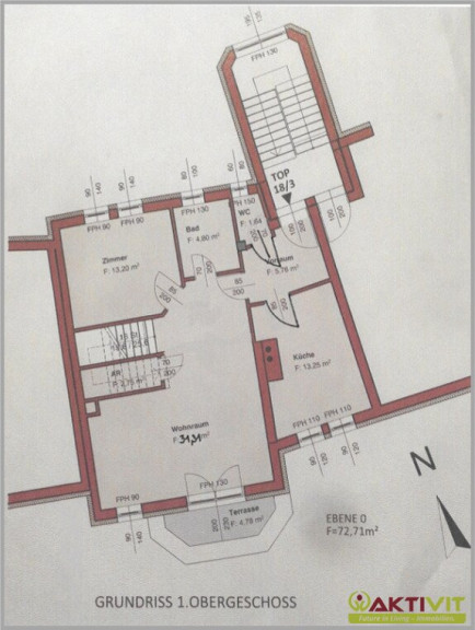 Die Wohnung ist als Maisonette ausgeführt und erstreckt sich über das 1. Obergeschoss und das Dachgeschoss. Im 1. Obergeschoss stehen ein Vorraum mit ca. 8,76 m², eine Küche mit ca. 13,25 m², ein Bad mit ca. 4,80 m², ein separates WC mit ca. 1,64 m², ein Schlafzimmer mit ca. 13,25 m², eine Abstellkammer mit ca. 2,75 m² sowie ein großzügiges Wohnzimmer mit ca. 31,31 m² zur Verfügung. Ergänzt wird diese Ebene durch eine kleine Terrasse mit ca. 4,76 m².