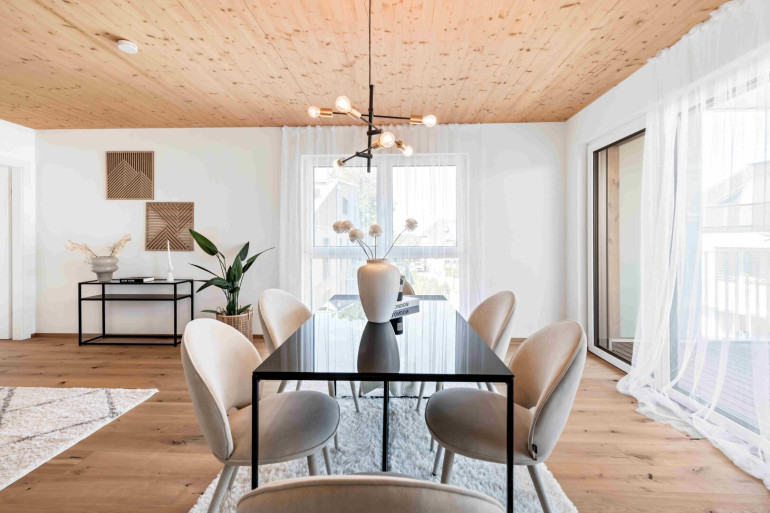 Die formschöne Architektur der mit vorvergrauten Lärchenholzfassaden veredelten Stadtvillen passt sich dank großzügiger Freiräume harmonisch an die natürliche Umgebung an. In Summe bieten die vier getrennten Häuser – zwei davon verfügen über eine direkte Garagenanbindung – auf jeweils drei Ebenen ausreichend Platz für insgesamt 36 barrierefreie Zwei- bis Vier-Zimmerwohnungen.