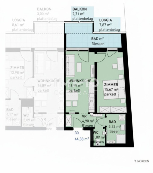- Jede Wohnung mit privater Freifläche (Loggia, Balkon, Terrasse, Eigengarten)