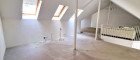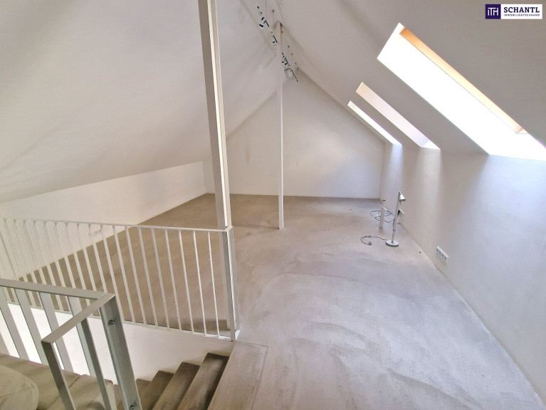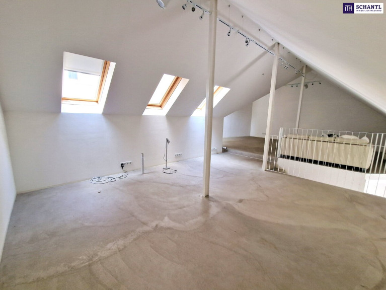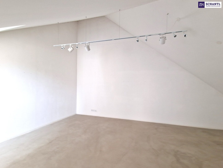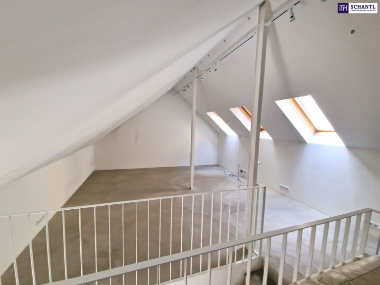 Im Obergeschoss erwartet Sie ein großzügiger, offener Raum, der sich perfekt als Wohnbereich oder – wie aktuell gewidmet – als großer Arbeitsplatz eignet. Ideal für eine Kanzlei, ein Atelier oder ein Home-Office.